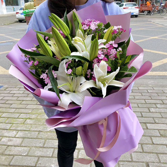 Pure Serenity: 6 White Oriental Lilies in Dusty Lavender