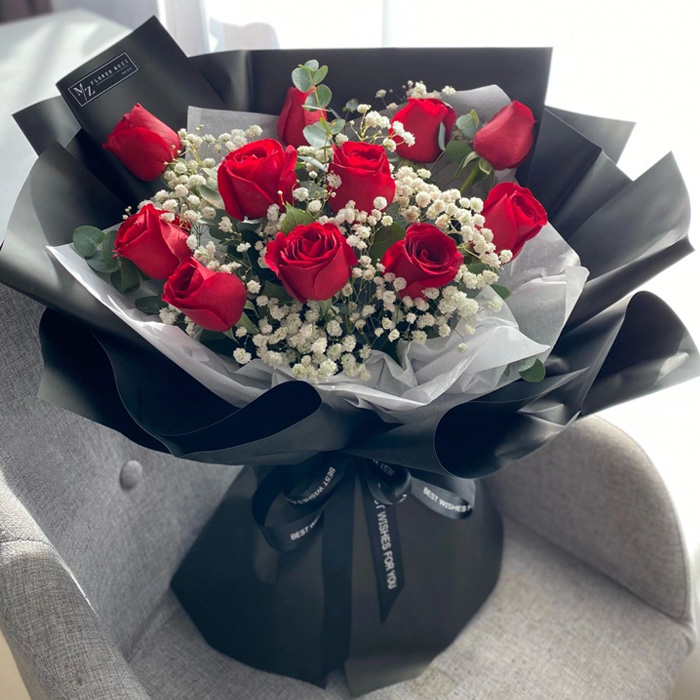 11 Red Roses & Gypsophila - Noir Elegance Bouquet